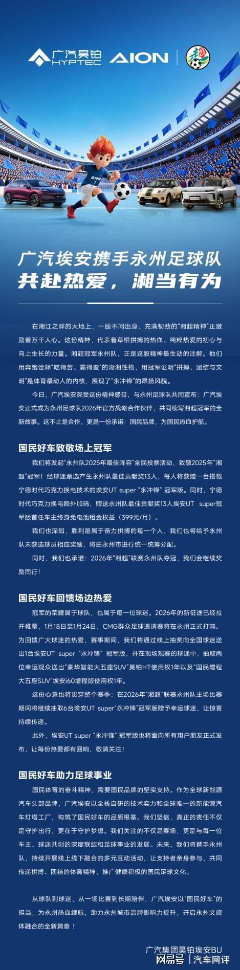 从“为国民造好车”到“与国民共热爱”,广汽埃安与永州足球队的牵手,是国民品牌与城市精神的双向奔赴。2026赛季,让我们期待永州队带着这份支持奋勇冲锋,也期待广汽埃安以硬核产品力与暖心福利,持续为湖南体育事业、区域发展注入向上的能量,让拼搏者发光,让热爱者圆梦!
