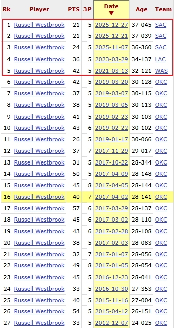 值得一提的是,威斯布鲁克生涯共28次(加上本场比赛)单场命中5+三分,其中雷霆时期22次,奇才时期1次,快船时期1次,国王时期42场4次!