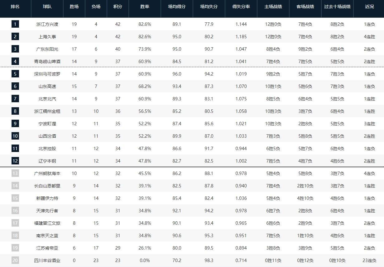 CBA常规赛第一阶段排名